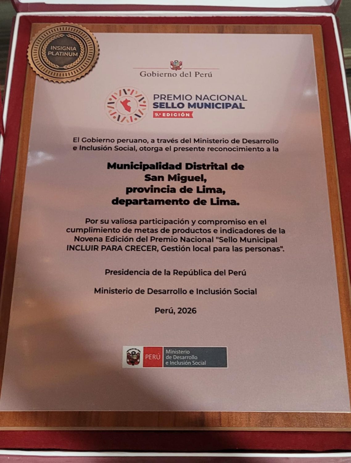 La Municipalidad Distrital de San Miguel obtuvo el Sello Municipal categoría Platinum otorgado por el Ministerio de Desarrollo e Inclusión Social (Midis), tras acreditar el cumplimiento integral y sostenido de los estándares establecidos para la gestión municipal.